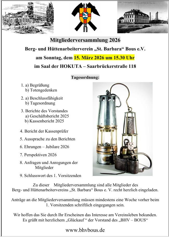 14.00 Uhr: Delegiertenversammlung des Landesverbands der Bergmanns-, Hütten- und Knappenvereine des Saarlands